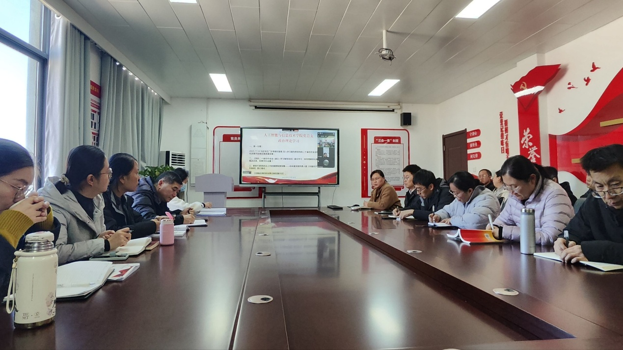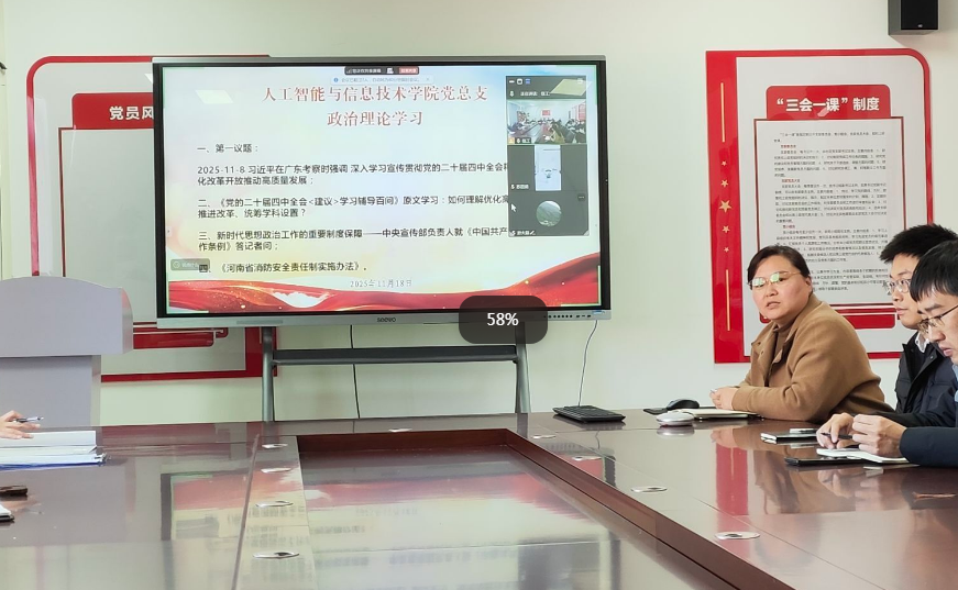 2025年11月18日,人工智能与信息技术公司党总支组织郑州校区和开封校区全体党员及教职工,开展政治理论学习活动。本次学习活动由人工智能与信息技术公司党总支书记崔琳主持。主要学习内容有:一、第一议题:2025-11-8 习近平在广东考察时强调,深入学习宣传贯彻党的二十届四中全会精神,以全面深化改革开放推动高质量发展;二、《党的二十届四中全会<建议>学习辅导百问》原文学习:如何理解优化高校布局、分类推进改革、统筹学科设置?三、新时代思想政治工作的重要制度保障——中央宣传部负责人就《中国共产党思想政治工作条例》答记者问;四、《河南省消防安全责任制实施办法》。