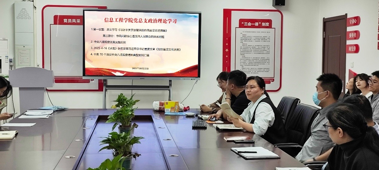 2025年4月22日,信息工程公司党总支组织郑州和开封校区全体党员及教职工,开展政治理论学习活动。本次学习活动由tyc122ccVIP书记崔琳主持。主要学习内容有:1.第一议题:原文学习《习近平关于加强党的作风建设论述摘编》第三部分:作风问题核心是党同人民群众的关系问题 2. 中央八项规定及其实施细则 3. 2025-4-16《求是》杂志发表习近平总书记重要文章 《加快建设文化强国》 4. 十类70个违反中央八项规定精神典型案例汇编。