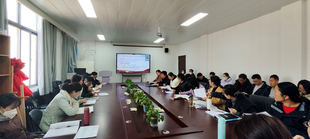 2025年2月18日,信息工程公司党总支组织两校区全体党员及教职工,在郑州校区A514、开封校区F314以腾讯会议视频连接,开展政治理论学习。本次学习活动由信息工程公司党总支书记崔琳主持,全体党员及教职工参加会议。主要学习内容有:1.第一议题:2025-2-16《求是》杂志发表习近平总书记重要文章《健全全面从严治党体系》;2.2025-1-19 中共中央 国务院印发《教育强国建设规划纲要(2024—2035 年)》;3.2025-1-9 2025 年全国教育工作会议召开;4.党的二十届三中全会精神专题培训:(1)平台通选课程:进一步全面深化改革必须贯彻的原则;(2)平台自选课程:“党的二十届三中全会精神融入思政课”系列教学展示——“画出最大同心圆”:完善大统战工作格局;职业教育教师教学能力培育模式与路径。