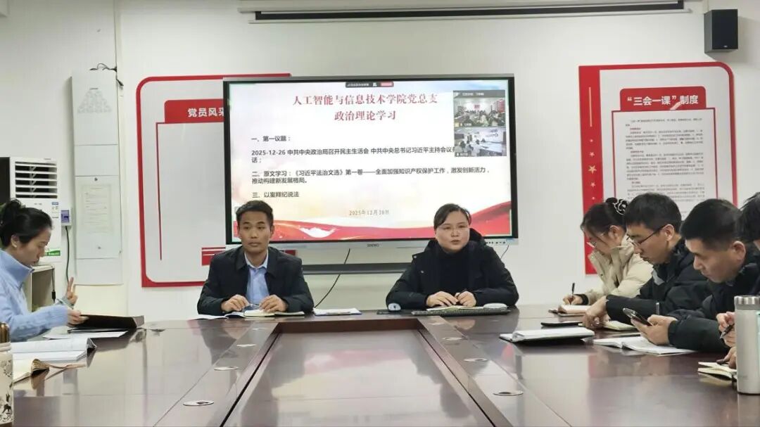 2025年12月30日,人工智能与信息技术公司党总支组织郑州校区和开封校区全体党员及教职工,开展政治理论学习活动。本次学习活动由tyc122ccVIP书记崔琳主持。主要学习内容有:一、第一议题:2025-12-26 中共中央政治局召开民主生活会中共中央总书记习近平主持会议并发表重要讲话;二、原文学习:《习近平法治文选》第一卷——全面加强知识产权保护工作,激发创新活力,推动构建新发展格局;三、以案释纪说法。