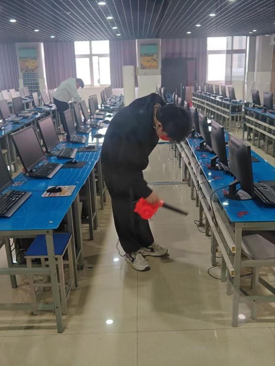 活动当日,在机房管理老师的悉心指导下,同学们迅速行动,明确分工。小心翼翼清理机箱,确保设备的顺畅运行;认真仔细扫拖地面、擦桌子、玻璃,铲除顽固的胶渍等,力求尽善尽美,在整个清扫过程中,同学们毫无怨言,不怕脏、不怕累,干劲十足,以饱满的热情为营造良好的考试环境贡献着自己的力量。